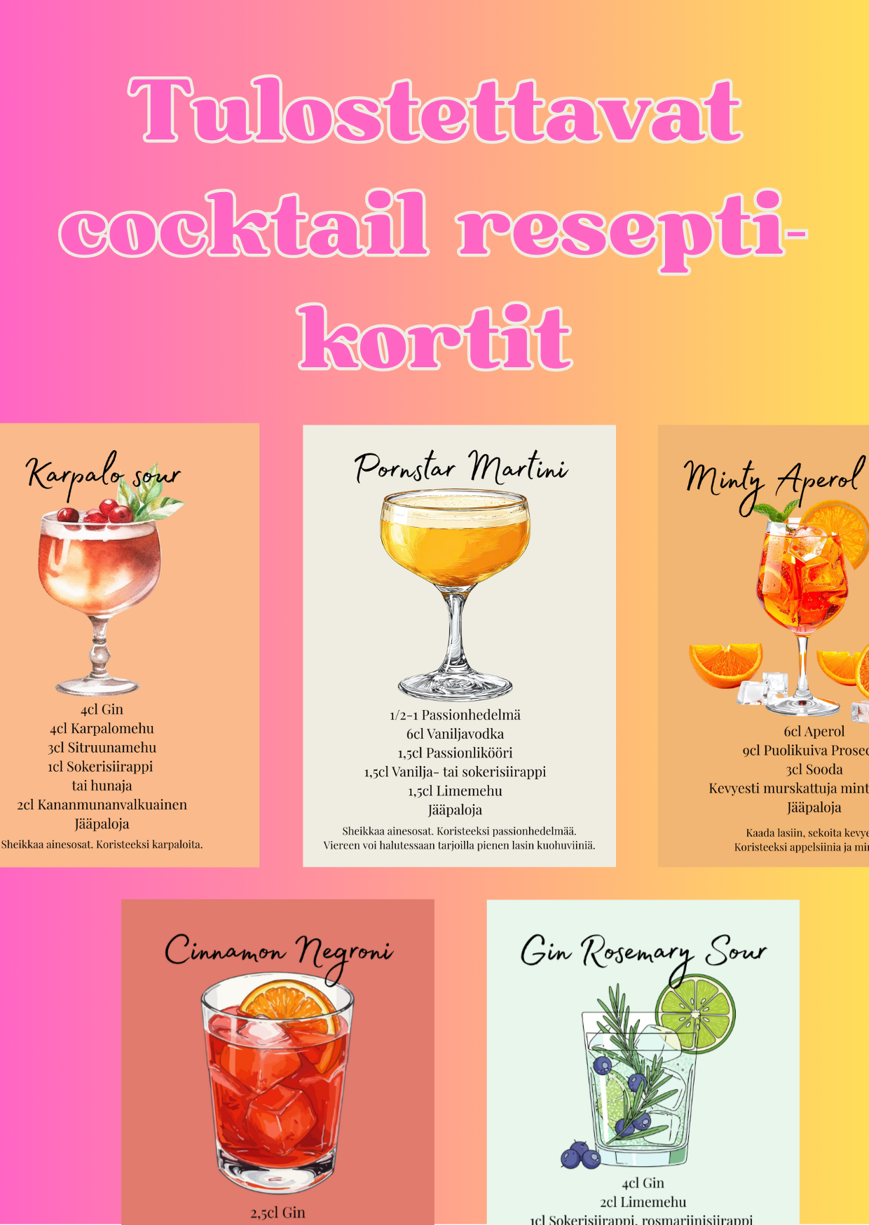 Tulostettavat cocktailresepti-kortit juhliin! - Värillinen tausta