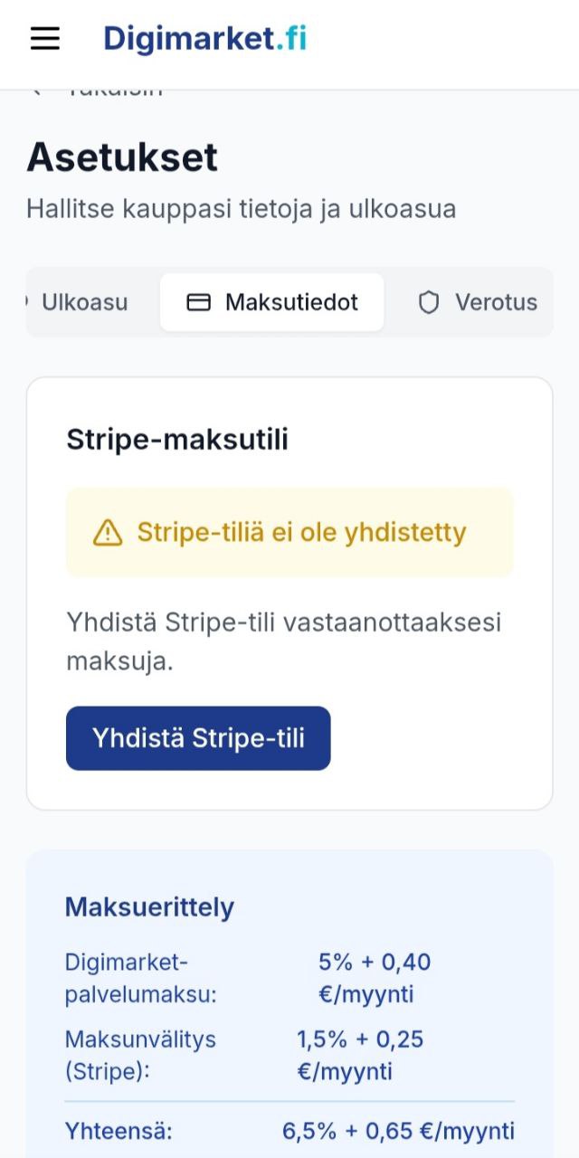 Maksaako Stripe-tili jotain? Ei! Stripe-tilin luominen ja käyttö on ilmaista. Kaikki maksut (Digimarketin 5% + 0,40€ ja Stripen 1,5% + 0,25€) vähennetään automaattisesti myynneistä – sinun ei tarvitse maksaa mitään erikseen.
