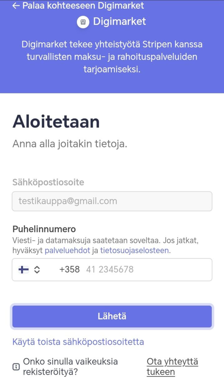 Kun yhdistät Stripe-tilin Digimarket-kauppaasi, saat käyttöösi turvallisen maksunvälityksen ja rahat siirtyvät automaattisesti omalle pankkitilillesi.