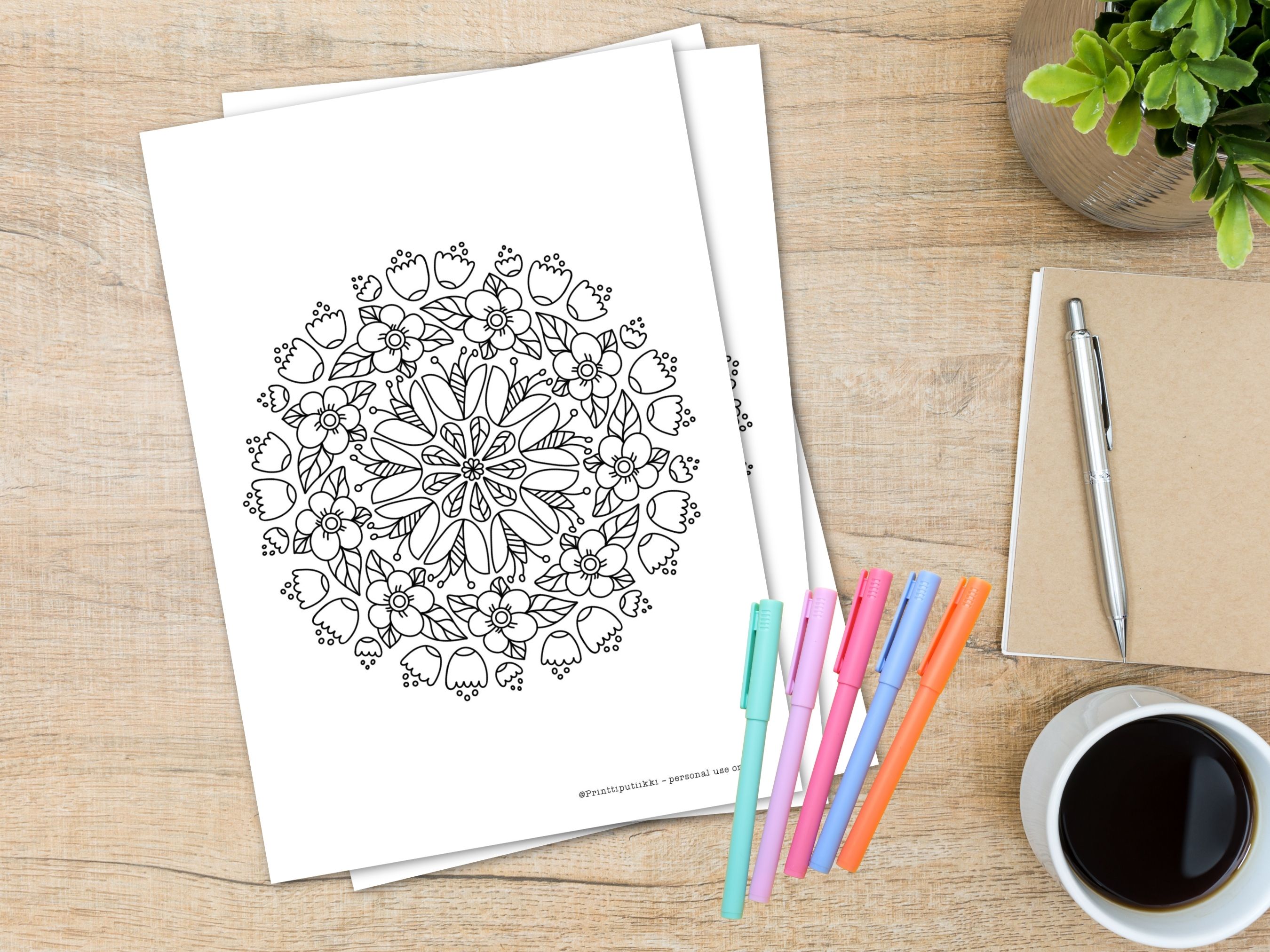 Tämä ladattava 10 kuvan mandalavärityskirja on saanut inspiraationsa kukista ja kasveista. Värittämisen avulla voit hetkeksi unohtaa kiireet ja keskittyä vain luovuuteen ja rentoutumiseen. Miksi tämä värityskirja on ihana: - 10 erilaista mandalaa, joiden teemana kukat ja kasvit - Sopii kaikentasoisille värittäjille - Ladattava PDF-tiedosto – tulosta kuvat niin monta kertaa kuin haluat - Rauhoittava ja rentouttava hetki itselle tai lahjaksi - Kaikki kirjan kuvat on piirretty itse, eivätkä ne ole ostettuja valmismalleja tai tekoälyn tuottamia Saat ladattua PDF-tiedoston heti oston jälkeen. Huom: Tämä värityskirja on tarkoitettu vain henkilökohtaiseen käyttöön. Kuvien kopioiminen, myyminen tai muu kaupallinen käyttö ei ole sallittua.